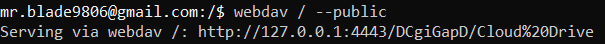Para conectarnos por medio de webdav deberemos emplear el comando webdav "ruta de la carpeta o archivo". En mi caso compartiré todo mi disco duro en mega desde la raíz, por tanto mi comando iría como:
